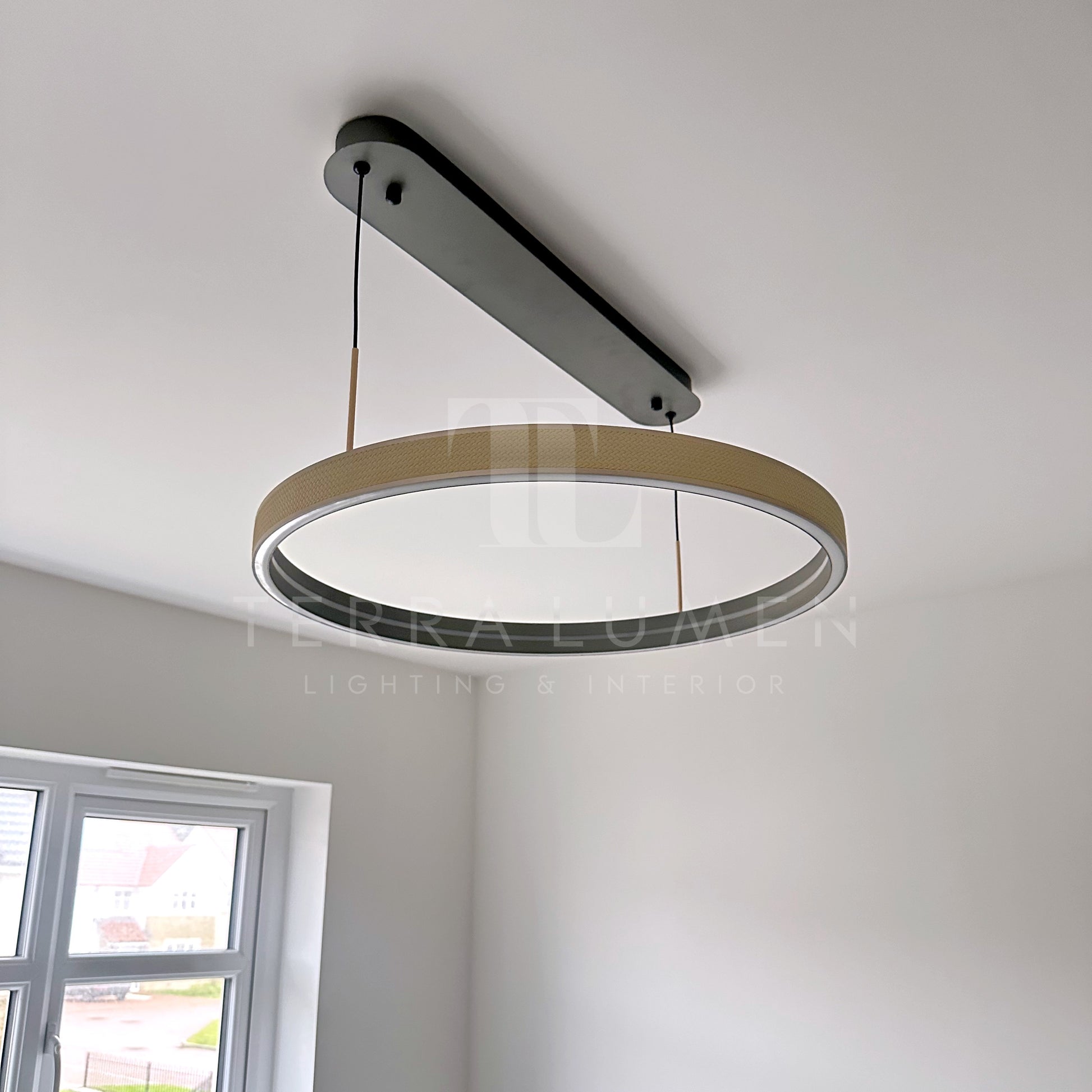 Introducing Our Carlo Single Ring Hanging Light: A Striking Fusion of Contemporary Design and Artful Detailing. This pendant light features a sleek black single ring adorned with intricate weaving on the outer edge, adding a touch of artistic flair to its modern silhouette. The eye-catching gold detailing enhances the overall elegance, creating a statement piece that seamlessly blends sophistication with unique craftsmanship.