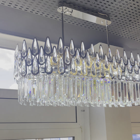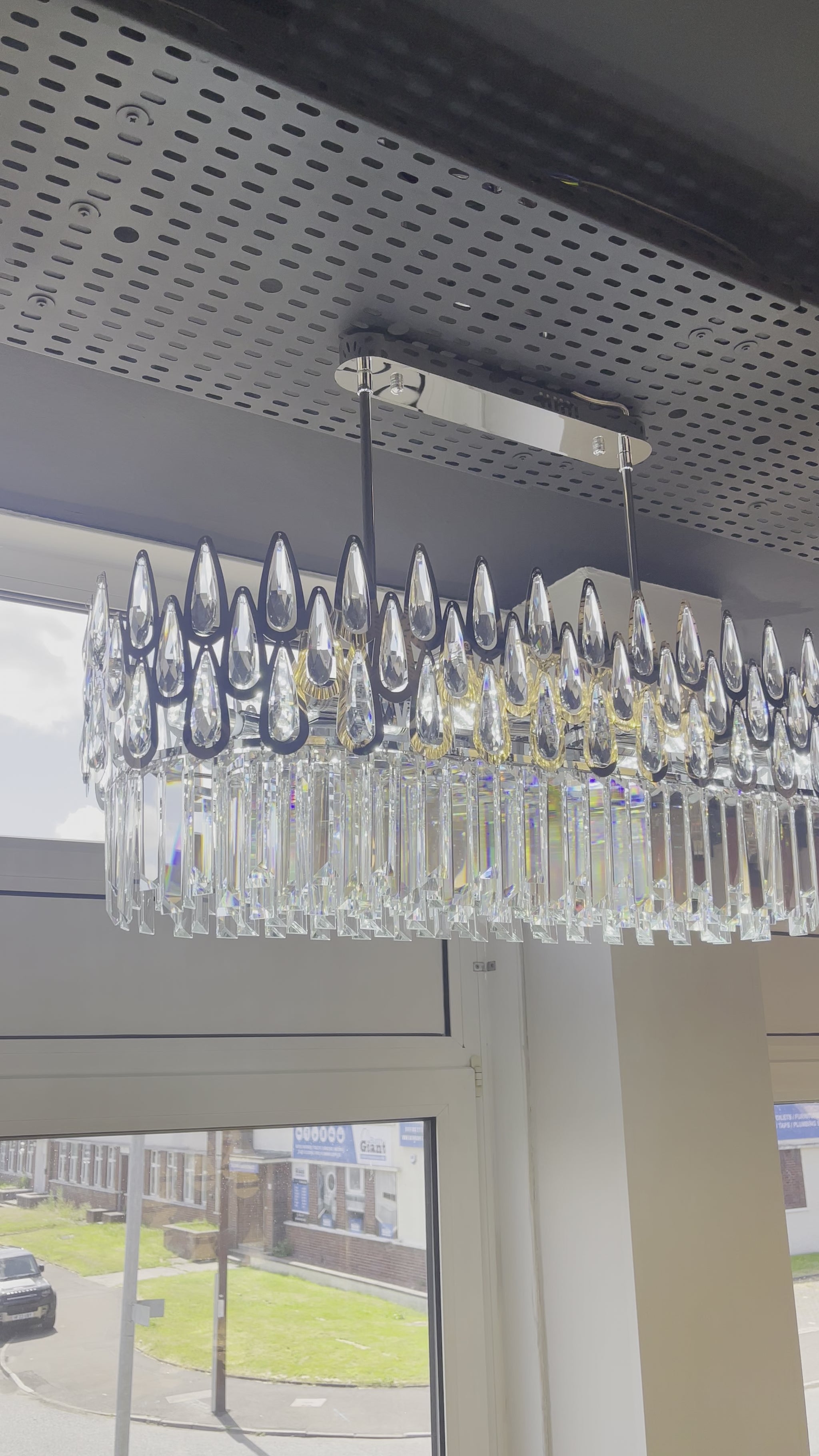 The Giovanna is an impressive hanging design that is ideal for a living room. The top features teardrop-shaped crystals arranged in a chevron pattern followed by long hanging crystals at the bottom to create a visually rich image of lights being diffused from all angles throughout the polished chrome frame.