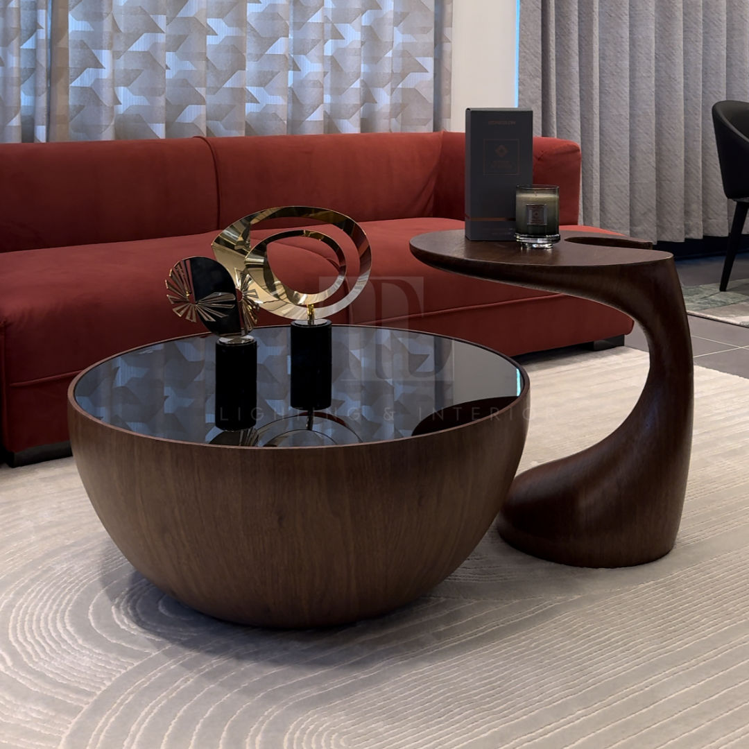 Introducing the Lunar Coffee and Side Table Set, a harmonious fusion of modern elegance and sculptural design. The coffee table features a striking spherical wooden base paired with a sleek black glass top, reminiscent of the moon’s ethereal glow. Complementing it is a uniquely curved side table, echoing the same rich wood tones, providing both style and functionality. Together, this set adds balance and sophistication to any living space, making it the perfect statement for both contemporary and classic interiors. Elevate your home with this captivating duo, designed for those who appreciate timeless elegance.