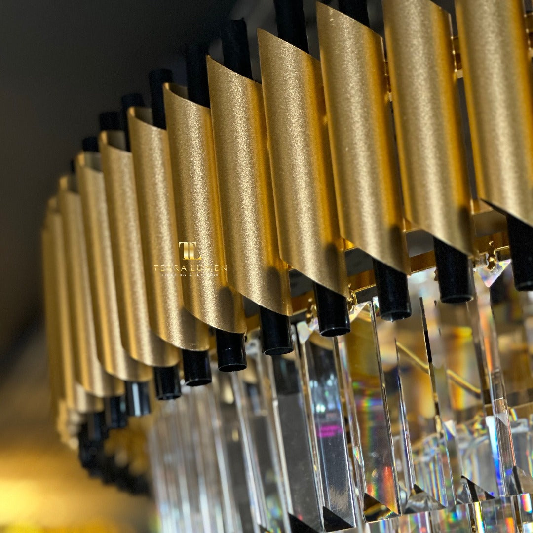This stunning chandelier is the perfect centre piece for any lounge and bedroom. Featuring a gold frame with black details which is perfect for adding character to any room.