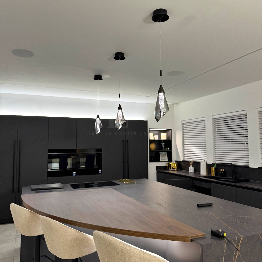 Our Quinn Single Pendant Lights offer a touch of sophistication and contemporary elegance to any space. Available in three stunning finishes—Brushed Chrome, Gold, and Pearl Black—these pendant lights are designed to suit a variety of interior styles. Each pendant light features a sleek teardrop-shaped glass shade with a mesmerizing bubble effect crystal encased inside. The intricate bubble design creates a captivating play of light, adding depth and sparkle to your room.